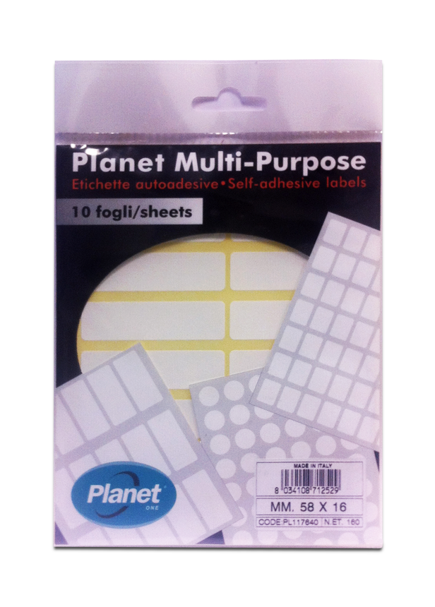 Etichette autoadesive bianche e colorate, con collante permanente. Formato del foglio mm. 165 x 130. Confezionate in bustina di polipropilene da 10 fogli
